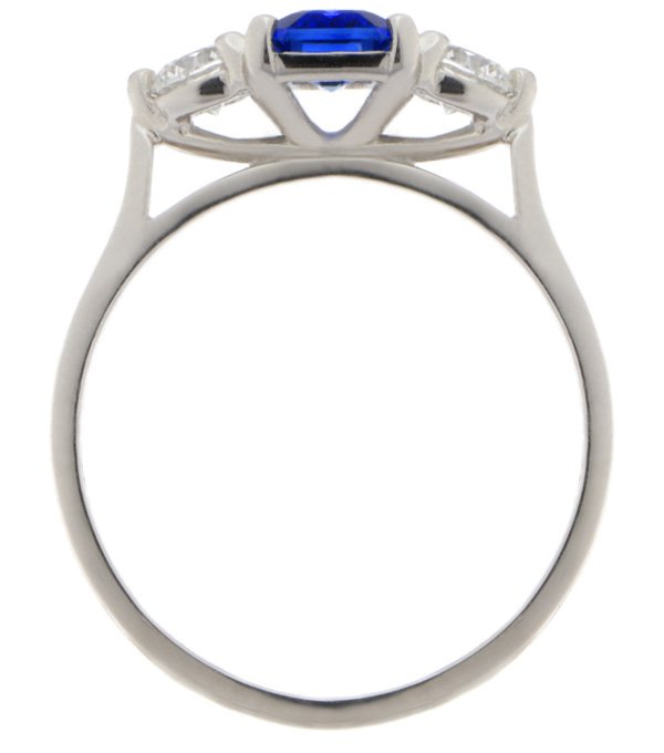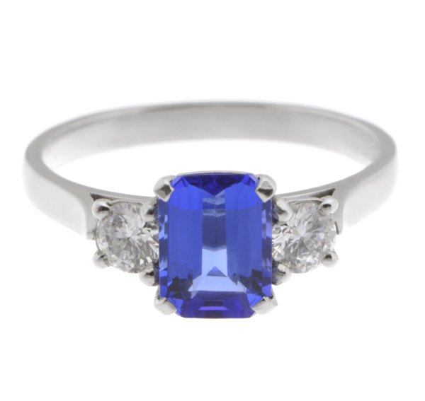 A classic claw set octagon tanzanite trilogy ring with two round brilliant cut diamonds set with four claws to either side.