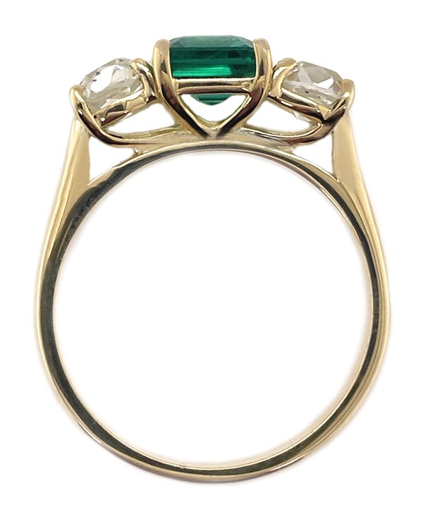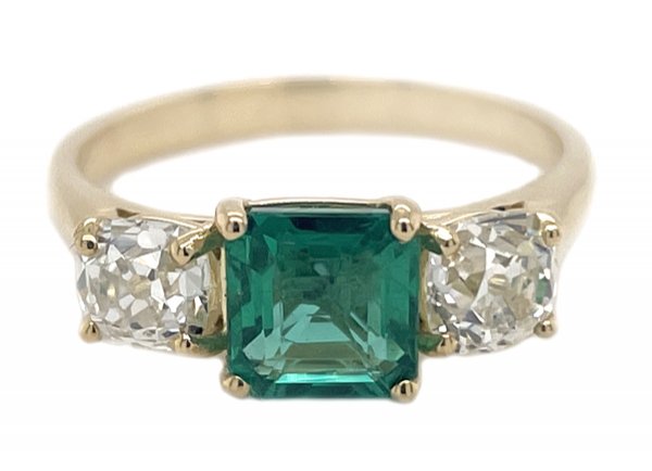 A classic claw set square shape octagon or Asscher cut green emerald trilogy ring with two old cut diamonds set with four claws to either side.