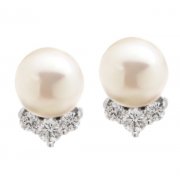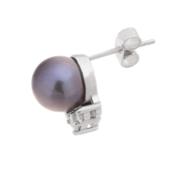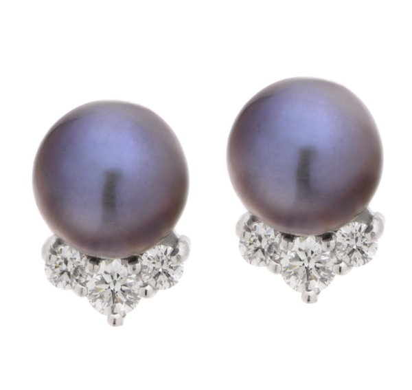 An elegant drop design with a round black coloured freshwater cultured pearl and a trilogy of round diamonds set underneath.