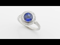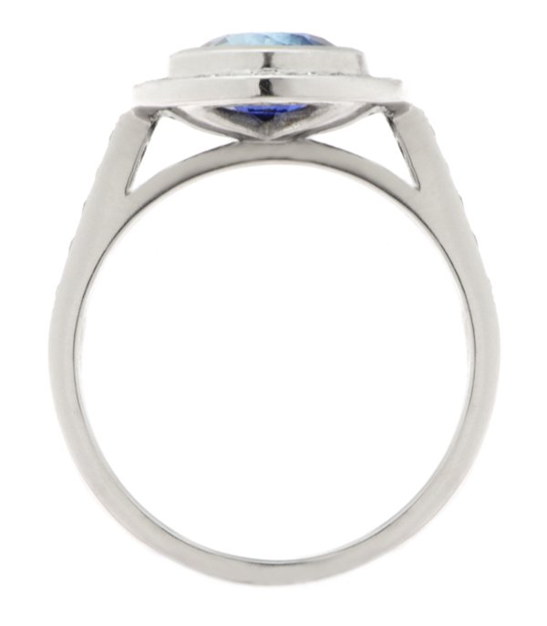 A classic round blue sapphire cluster ring with a halo of grain set round brilliant cut diamonds and diamond set shoulders or band.