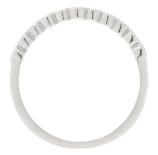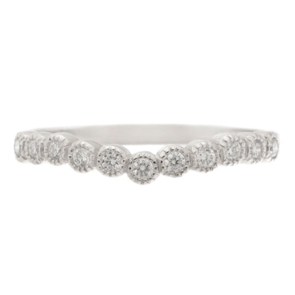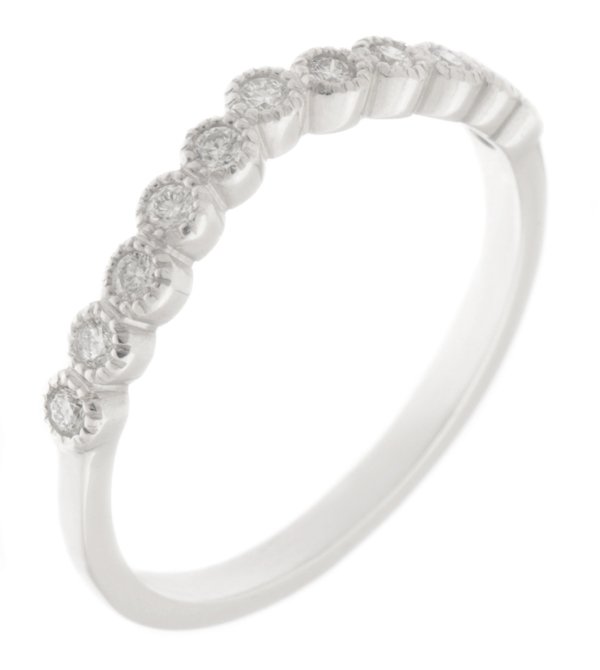 A shaped eternity style or wedding ring with rubover set round brilliant cut diamonds and a milled edge finish to the setting.