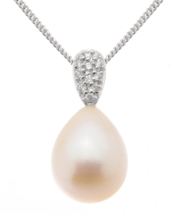 A classic teardrop or pear shaped white cultured river pearl pendant with a pave diamond set loop.