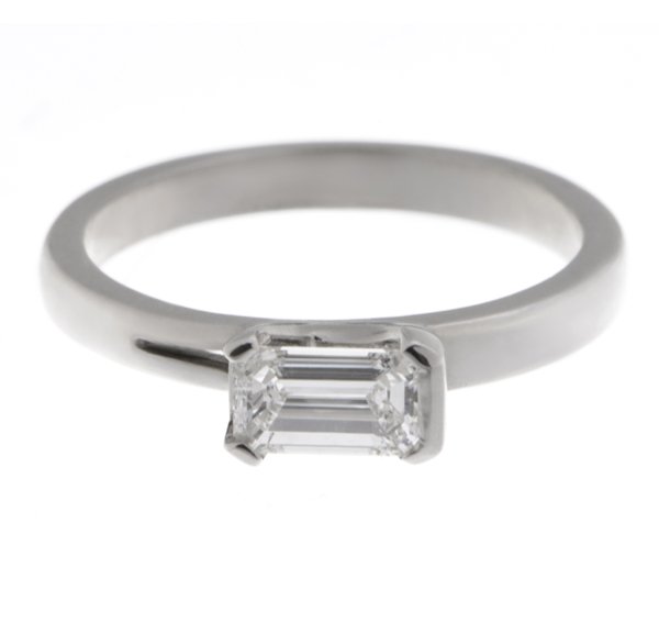 An art deco style emerald cut diamond solitaire ring with a very modern, contemporary look with semi rubover and claw setting combined.