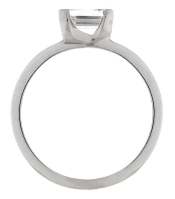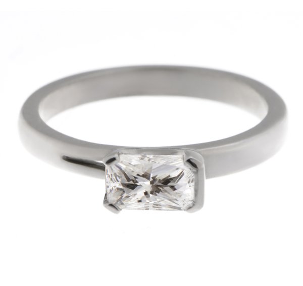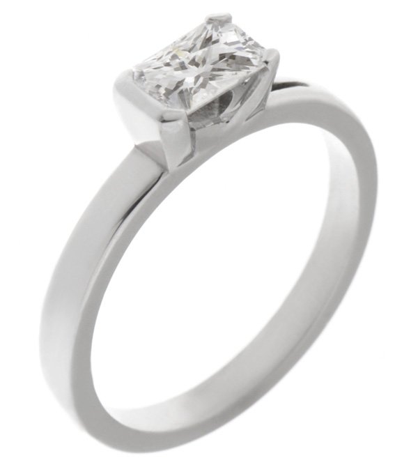 An art deco style radiant cut diamond solitaire ring with a very modern, contemporary look with semi rubover and claw setting combined.