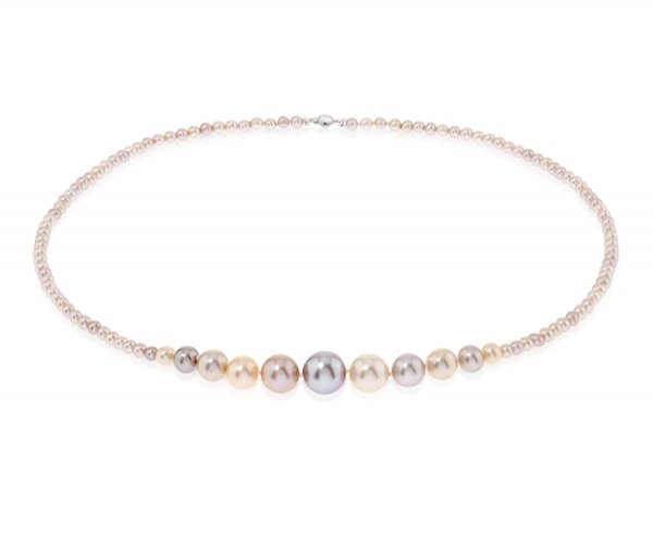 A freshwater cultured pearl graduated necklet with 4mm - 11.5mm natural multi coloured pearls and an oval ball clasp.