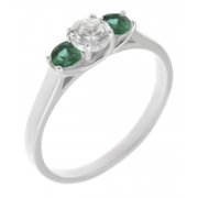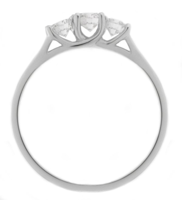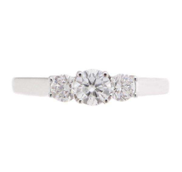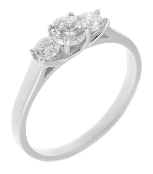 A classic trilogy style ring with a larger round diamond centre stone and two round brilliant cut diamonds claw set with a sweeping under setting.