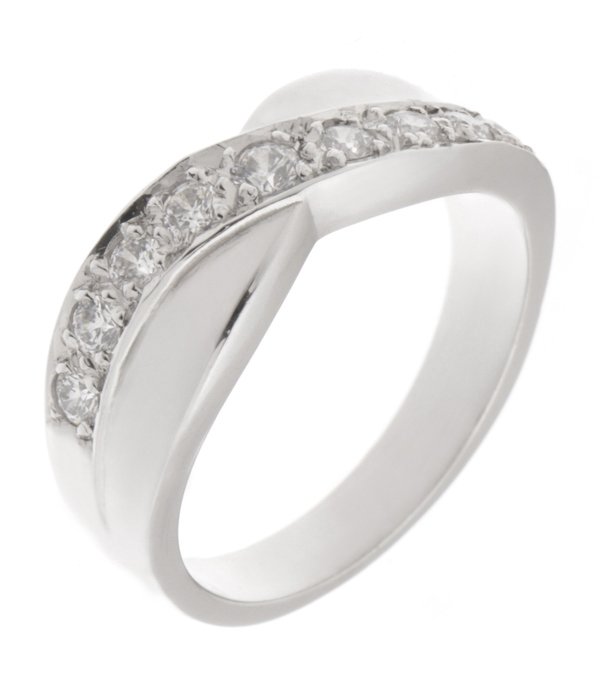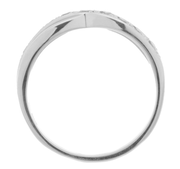 A crossover style, shaped half eternity ring with grain set round brilliant cut diamonds.